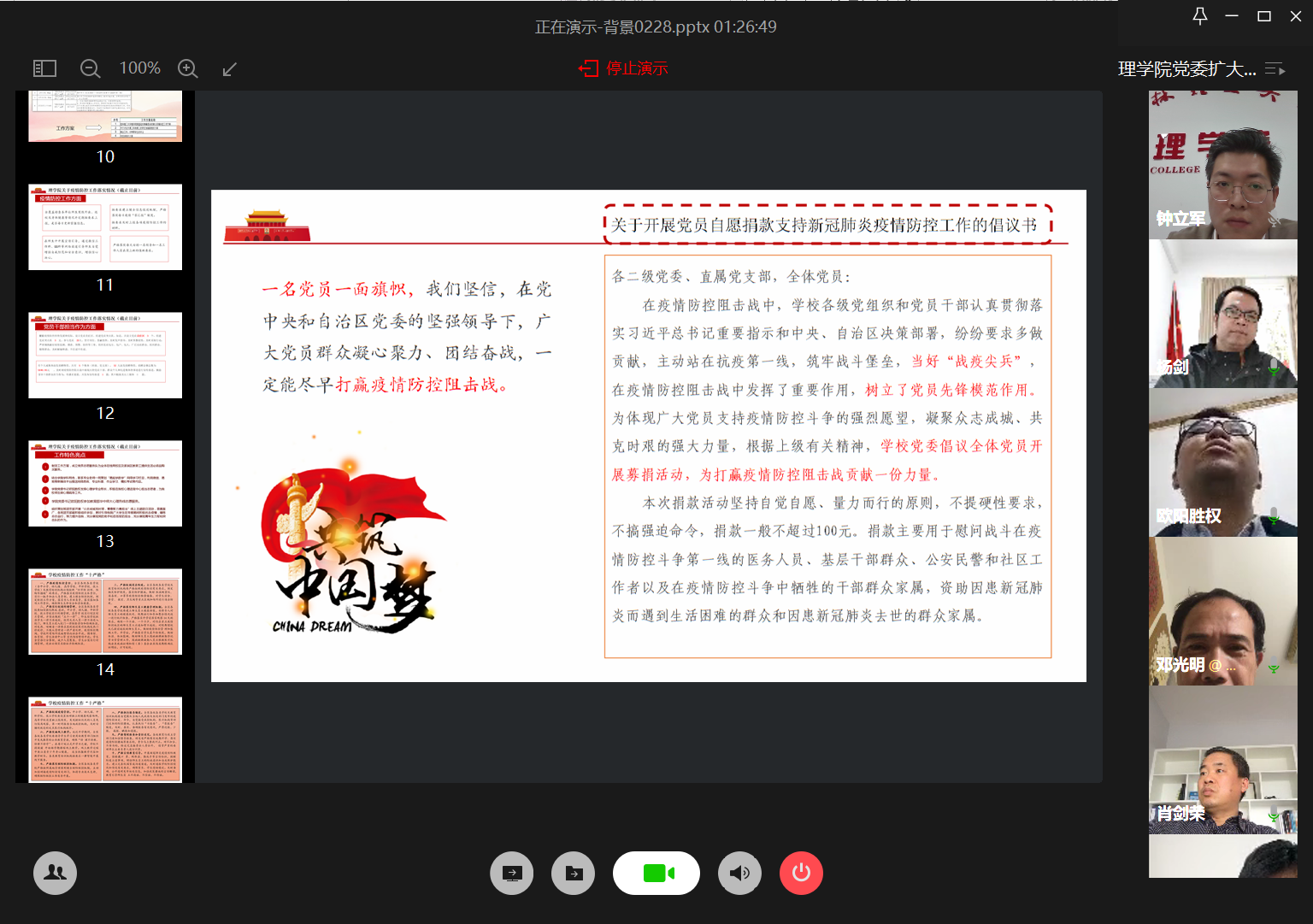 为坚决贯彻落实党中央国务院关于疫情防控的决策部署,贯彻落实教育部“两联防”“两确保”和“十严格”要求,切实做好新型冠状病毒感染的肺炎疫情防控工作,2月28日下午,理学院召开疫情防控工作网络视频会议,会议由学院党委书记欧阳胜权主持,学院党委副书记、院长肖剑荣、党委副书记钟立军、副院长张富文、蒋远营、李明,院长助理张浩敏、党委委员邓光明以及各党支部书记参加会议。
