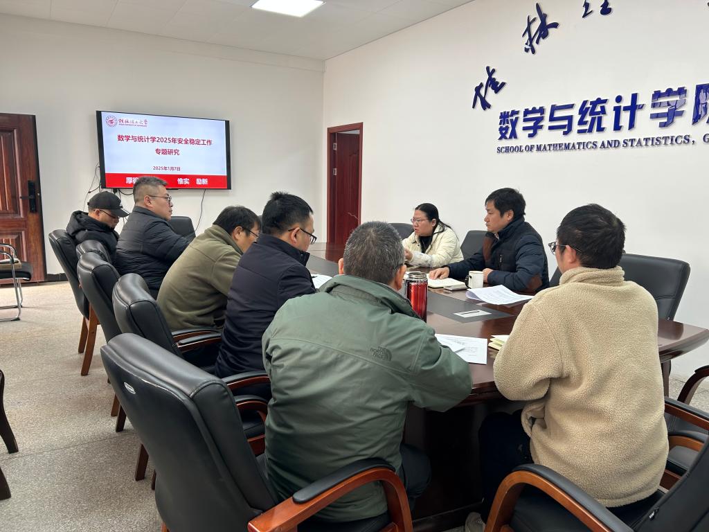 1月7日,数学与统计学院在雁山校区08203会议室召开2025年安全稳定工作专题会议。学院全体党政领导班子、党政办主任、学工组长参加本次会议,会议由学院党委书记江玲主持。