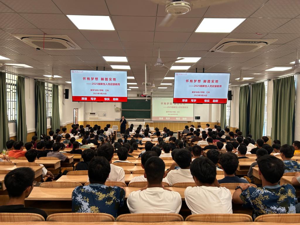 为切实加强2025级新生理想信念教育,进一步加深新生对党的认识,切实抓好新生入党启蒙教育关键期,引导新生积极向党组织靠拢。9月26日,数学与统计学院在雁山校区06408举办了2025级新生入党启蒙教育。学院党委书记江玲主讲,以“怀抱梦想,脚踏实地”为主题,为全院新生带来了一场富有思想性和启发性的入党启蒙教育。