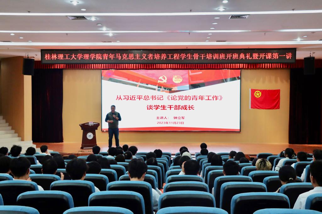 为深入学习贯彻习近平新时代中国特色社会主义思想和党的二十大精神,持续推进青年马克思主义者培养工程,数学与统计学院于2023年11月23日晚在雁山校区图书馆报告厅举办第四期青年马克思主义者培养工程学生骨干培训班开班典礼暨开课第一讲。学院党委副书记钟立军老师出席本次活动,团委、学生会全体成员,各社团和协会代表,23级班长和团支书等青马班成员参加本次活动,活动由学院团委副书记彭娇娇老师主持。
