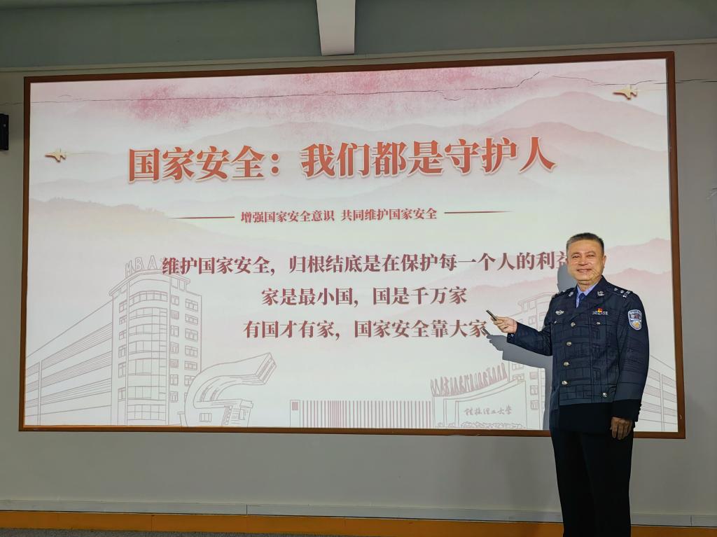 桂林市公安局雁山分局驻校警务联络官、保卫工作部政保户籍科副科长曾学师进行授课