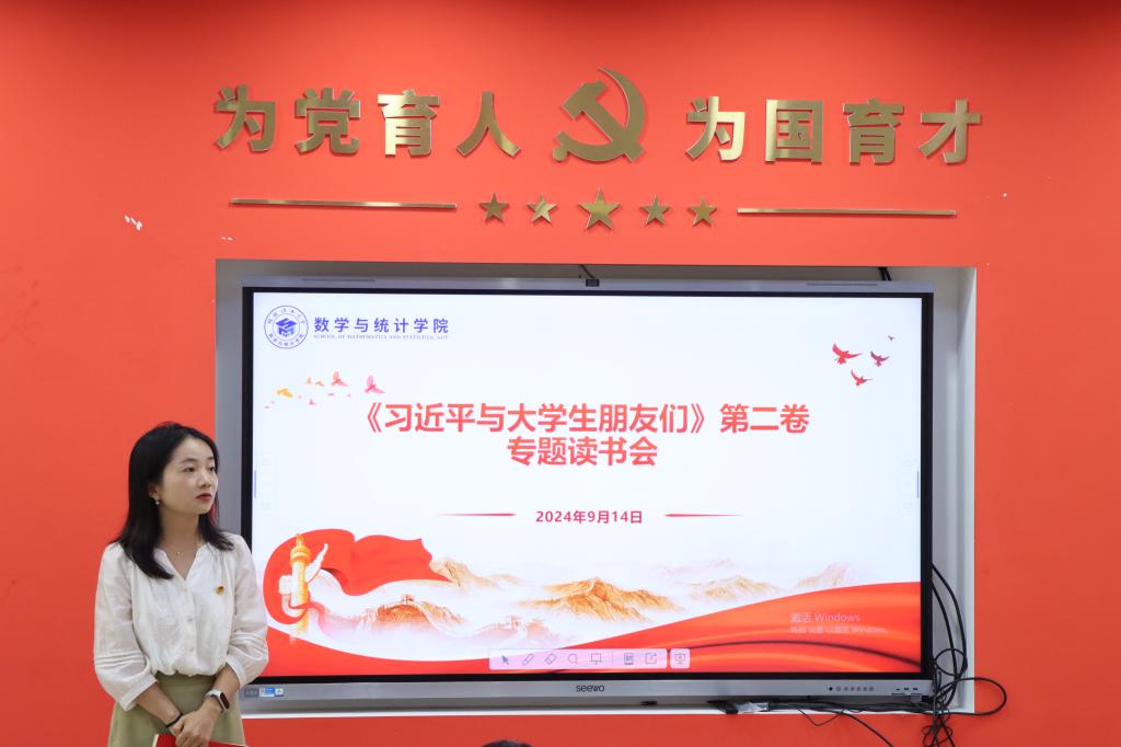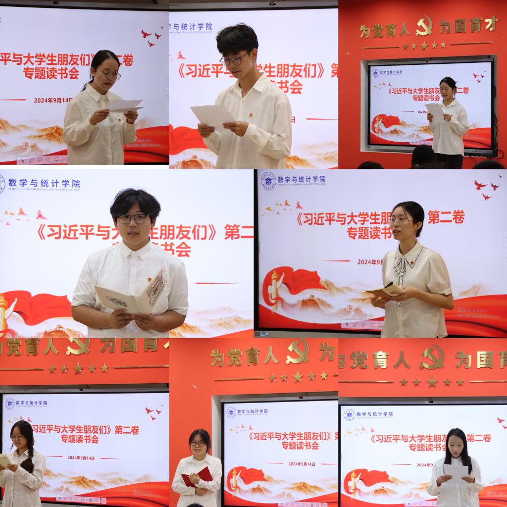 为深入学习贯彻习近平总书记关于青年工作的重要思想,数学与统计学院于2024年9月14日和24日,分别面向青马班成员和研究生会成员开展了《习近平与大学生朋友们》第二卷专题读书分享会。此次活动旨在通过研读著作、撰写笔记、分享心得,引导青年学生明确成长目标,坚定理想信念。