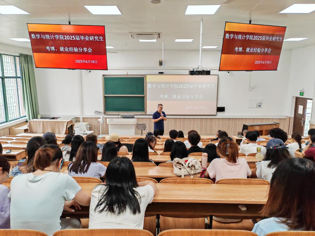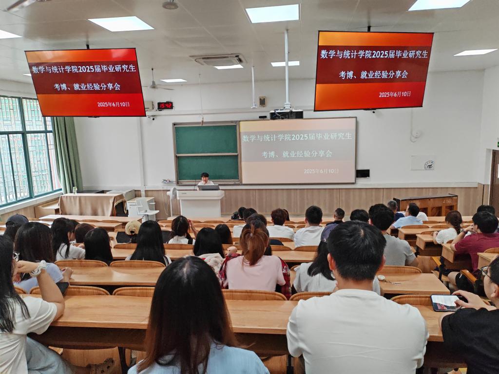 为帮助研究生明确职业规划,进一步提升就业竞争力,2025年6月10日,数学与统计学院在雁山校区07518教室举办了2025年研究生申博、就业经验分享会。学院党委副书记钟立军、副院长封全喜、副院长王彬及研究生导师代表罗梦卓出席活动。会议由钟立军副书记主持,吸引了众多研究生同学积极参与。