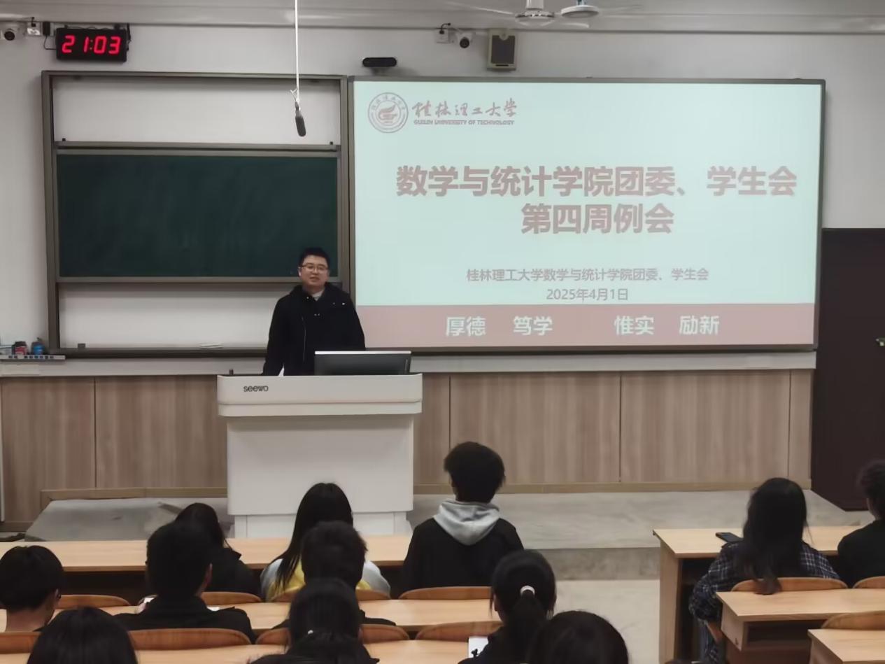 为强化团学工作思想引领,明确学生骨干职能定位、提升工作执行力,2025年4月1日数学与统计学院于雁山校区05314教室召开第四周团委、学生会及学生社团全体例会。学院团委书记李艮,全体团委、学生会及学生社团成员参加。