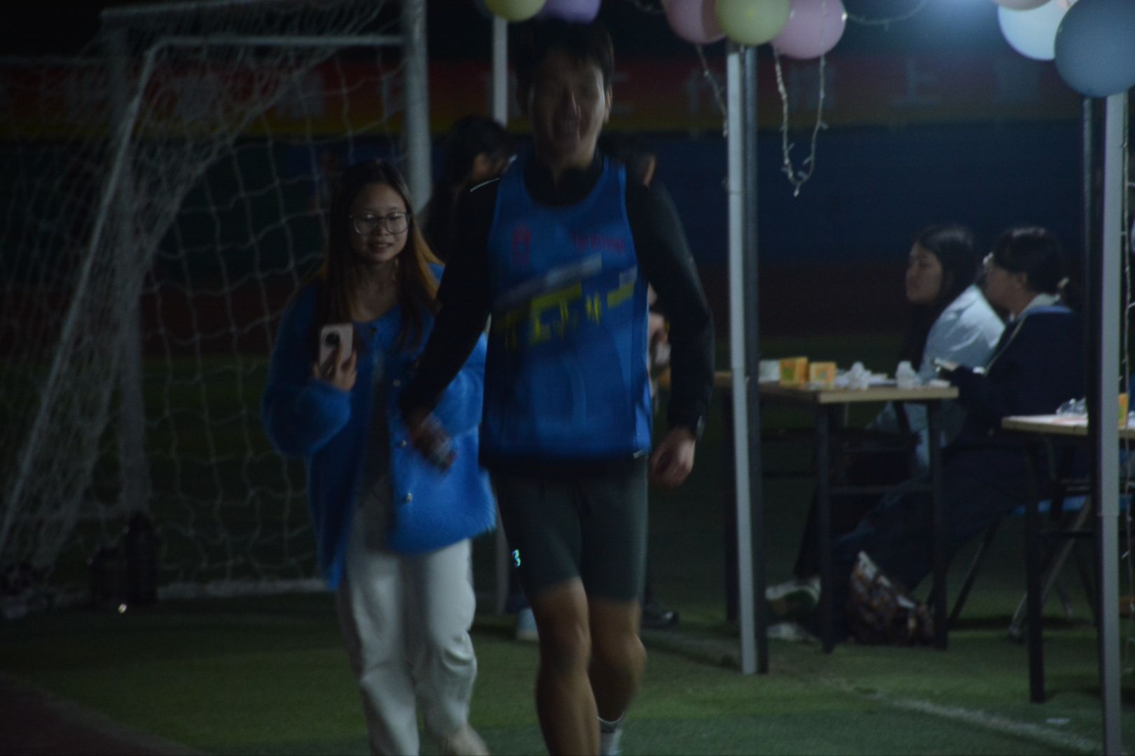 开幕式上,江苏维老师发表了热情洋溢的讲话,高度肯定了此次活动将公益与运动巧妙融合的创新模式,并激励同学们以实际行动诠释青春的责任与担当。随着发令枪响,参与者们迅速组成了绵延不绝的荧光队伍,从田径场出发,沿着校园的主干道井然有序地奔跑前行。夜幕下,闪烁的荧光犹如一条流动的星河,欢声笑语与整齐划一的脚步声交织成动人的旋律。不少路过的同学受到感染,纷纷自发加入,使得公益奔跑的队伍愈发壮大。
