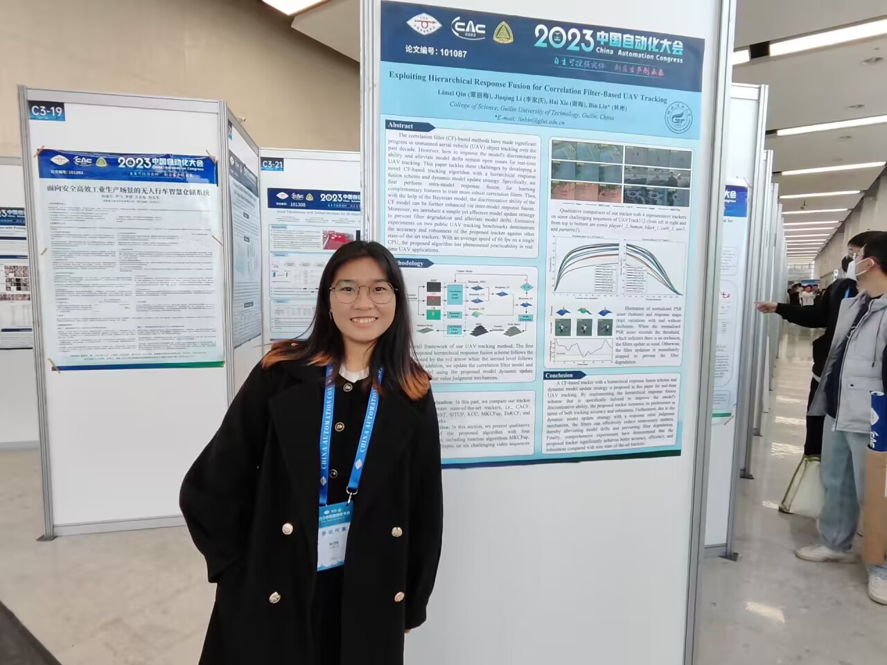 由我院信息与计算科学专业2020-2班覃丽梅和2021-1班李家庆共同撰写,信科教研室林彬和谢海两位老师共同指导的学术论文Exploiting Hierarchical Response Fusion for Correlation Filter-Based UAV Tracking被大会论文集收录,近期将提交至EI数据库检索。论文提出了一种面向无人机视频的视觉目标跟踪算法,通过在相关滤波跟踪框架中引入分层响应图融合和自适应模型更新策略,算法在应对尺度变化、相似物干扰、遮挡等复杂场景时的跟踪稳定性得到提升,并在多个无人机跟踪数据集的评测中取得了较为优异的跟踪性能。该论文是自治区级大学生创新创业训练计划项目(编号:202210596340)产出的科研成果。覃丽梅同学作为论文第一作者赴现场参会,通过海报的形式展示了论文的主要内容和创新点,并同其他与会者们进行了广泛而深入的学术交流。