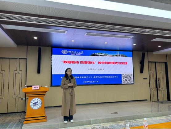 2024年12月11日,暨南大学经济学院副教授、博士生导师,全国教学创新大赛一等奖获得者侯雅文应我校邀请,莅临雁山校区行知楼406B会议室,为师生带来了一场题为“‘数据驱动 四度强化’教学创新模式与实践”的精彩报告。本次报告在学校本科生院(教师教学发展中心)指导下,由数学与统计学院主办,数学与统计学院副院长唐国强教授主持了研讨会。本科生院(教师教学发展中心)工作人员、数学与统计学院副院长封全喜教授、副院长王彬教授以及校内100余位教师参会。