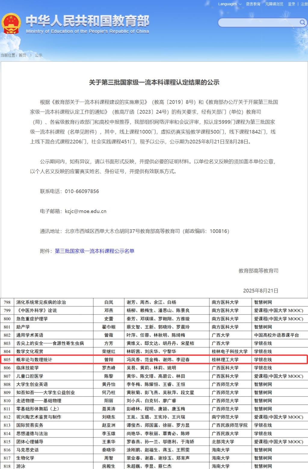 8月21日,教育部高等教育司公布《关于第三批国家级一流本科课程认定结果的公示》,数学与统计学院课程《概率论与数理统计》成功入选“国家级线上一流本科课程”,标志着学院课程建设进一步实现突破。