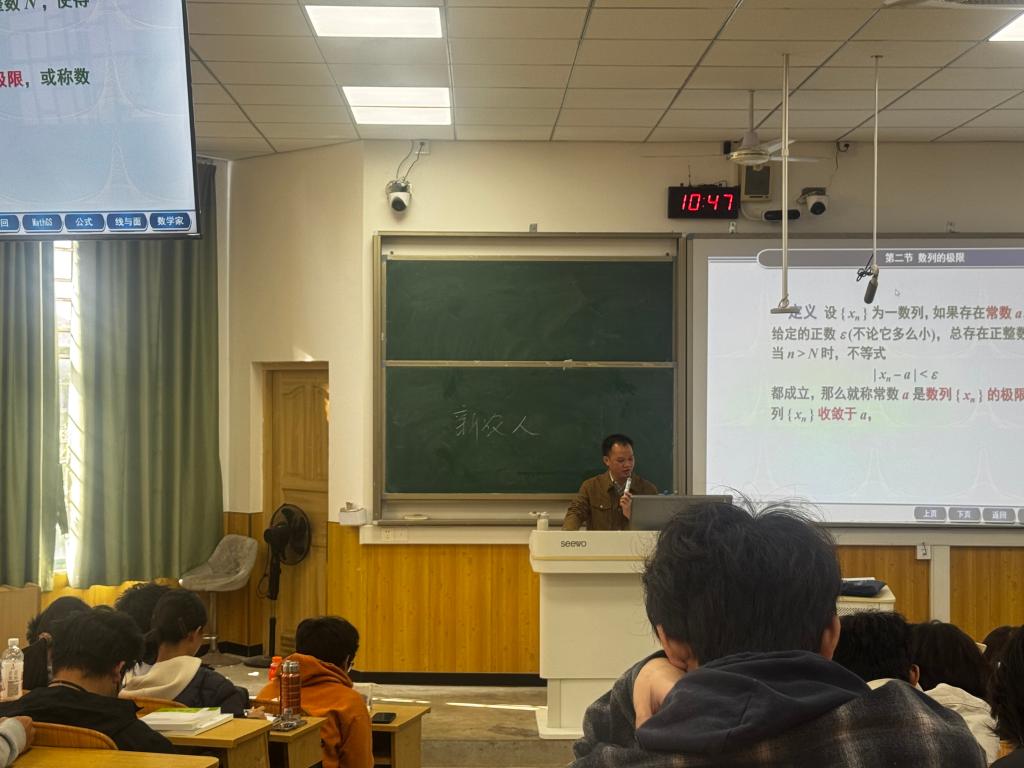 为深化课堂教学改革,推动教师交流互鉴,提升青年教师教学水平与课堂质量,11 月 25 日上午第 3 节课,我院基础数学教研室于 5306D 教室精心组织了一场教学观摩公开课。此次公开课由去年新入职的黄加炳老师主讲,授课主题为《数列的极限》,教研室无课教师及教学督导曾翔参与观摩。