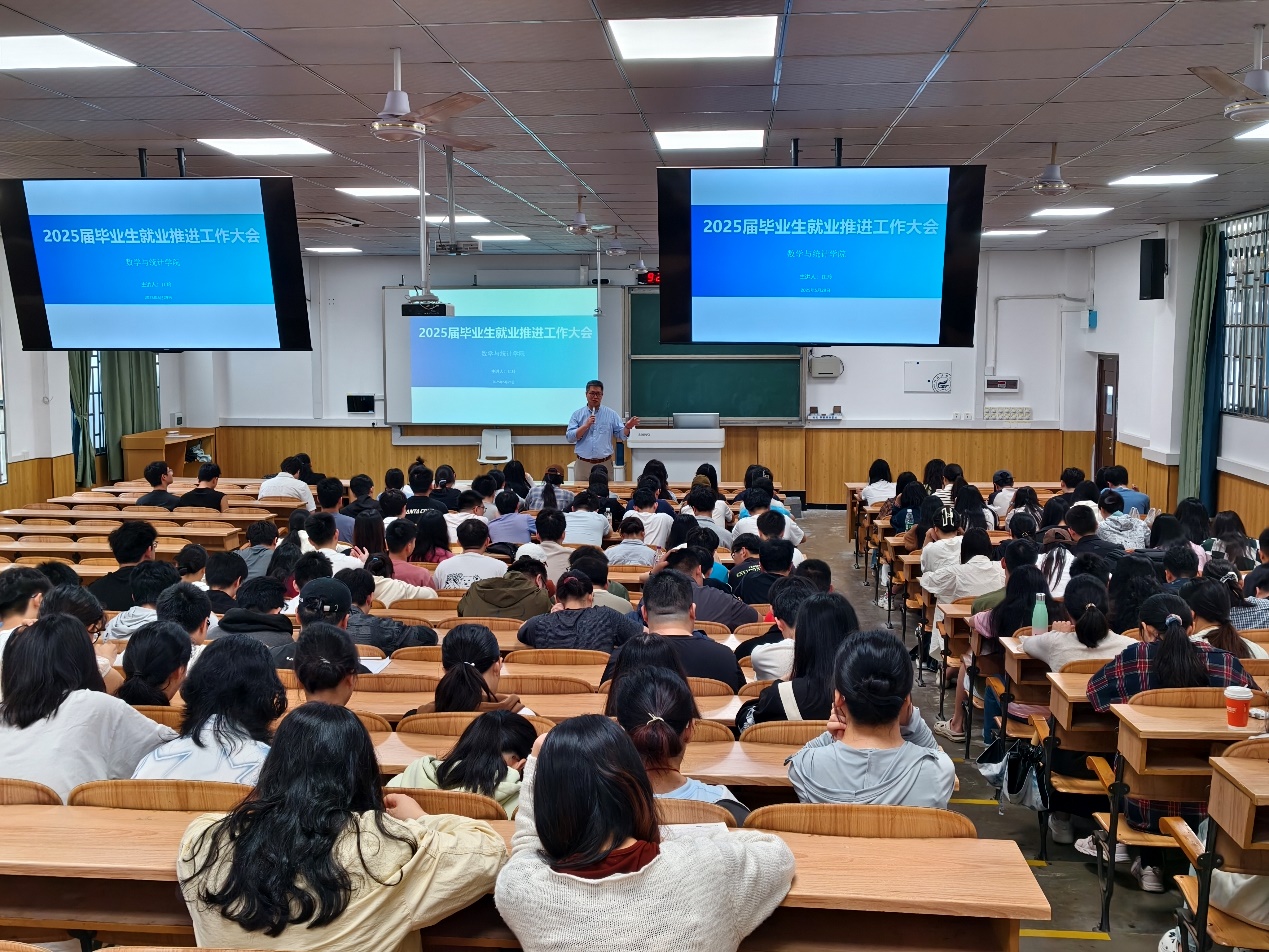 为助力毕业生明确就业方向、提升就业竞争力,5月29日上午,数学与统计学院在雁山校区06409教室召开2025届毕业生就业推进工作大会。学院党委书记江玲、党委副书记钟立军、团委书记兼毕业班辅导员李艮及全体毕业生参会,会议由钟立军主持。 会上,江玲围绕“挑战与机遇并存”的就业形势展开分析。她指出,2025年高校毕业生规模预计达1200-1222万人,青年失业率16.1%,传统行业岗位收缩,但人工智能、新能源、数字经济等领域人才缺口超500万,数学统计类专业在“东数西算”等国家战略中优势凸显。她强调,统计学专业在金融、互联网、生物医药行业需求占比65%,薪资较传统专业高30%以上;信息与计算科学专业在AI算法、网络安全等岗位年薪可达50-150万元。针对就业策略,她建议学生聚焦Python编程、统计建模等核心技能,通过校企实训、学科竞赛积累经验,鼓励深造或考取CFA、FRM等证书,并关注长三角、成渝经济圈等政策扶持区域。 此次大会为毕业生理清了就业思路,明确了技能提升方向与区域选择策略,增强了毕业生应对就业挑战的信心。学院将以此次会议为契机,持续深化就业指导服务,助力毕业生实现精准就业与高质量发展。 学院党委书记江玲作就业形势分析 活动现场