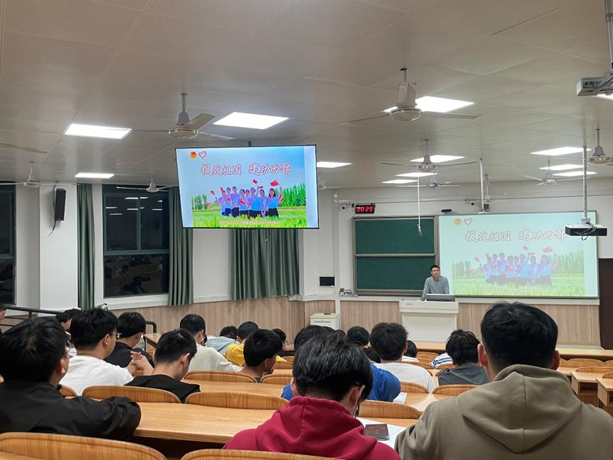 为激励学院学生投身西部、奉献基层,在广袤西部大地绽放青春光彩,实现个人价值与国家发展的紧密融合,3月23日晚,数学与统计学院在雁山校区07119室举办了“报效祖国,建功西部”大学生志愿服务西部计划宣讲会,活动由学院团委书记、毕业班辅导员李艮主持,全体2025届毕业生参加。